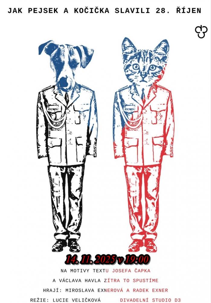 Tentokrát vám divadlo D3, v pátek 14.11.2025 od 19.00 hodin představí zároveň dva autory - Josefa Čapka a Václava Havla - ve hře "Jak pejsek a kočička slavili 28. říjen". Nenechte se, prosím zmást názvem hry - je opravdu určena dospělým divákům. Vstupné je dobrovolné. Těšíme se na vaši návštěvu . . .